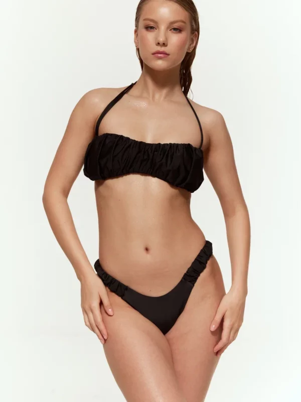 Особую изюминку плавкам придают аккуратные сборки по бокам, которые не только добавляют оригинальности дизайну, но и визуально корректируют силуэт, делая его более утонченным.