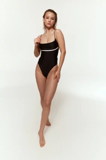 Передняя часть купальника акцентирует внимание на зоне декольте благодаря канту в виде горизонтальной линии, расположенной под грудью. Этот элемент не только визуально подчеркивает форму груди, но и обеспечит ее поддержку при этом, создавая эффект пуш-ап.